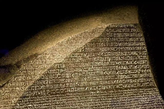 Batu berwarna gelap dari granodiorit itu yang kemudian dikenal sebagai Batu Rosetta menyimpan prasasti dalam tiga aksara: hieroglif Mesir, Demotik, dan Yunani.