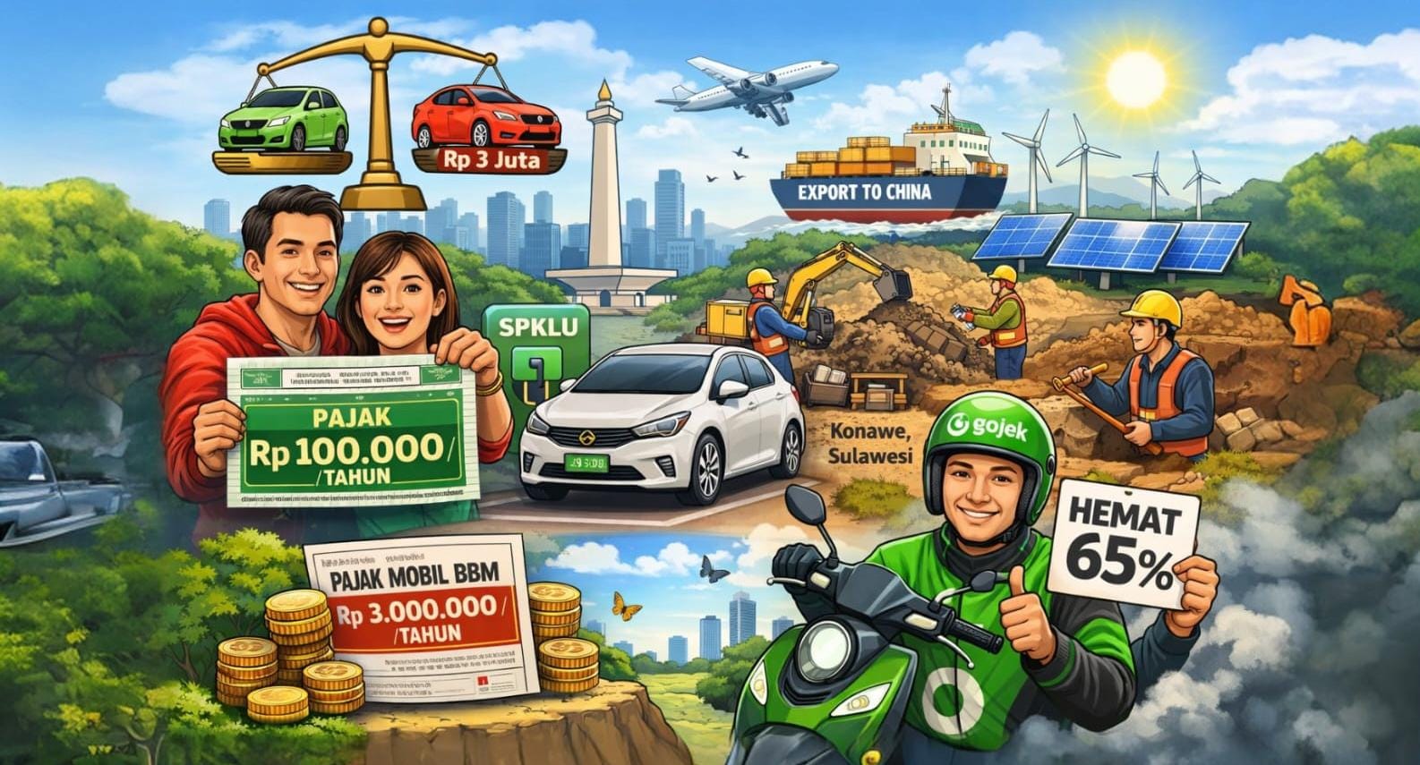 Ironisnya, di saat rakyat masih ragu, negeri ini justru duduk di atas harta karun baterai dunia. Nikel dari Konawe, Sulawesi Tenggara, salah satu bahan utama baterai lithium, digali dari tanah kita, diangkut ke luar negeri, terutama China, lalu kembali lagi ke kita dalam bentuk produk jadi dengan harga yang sudah “berasa internasional.”