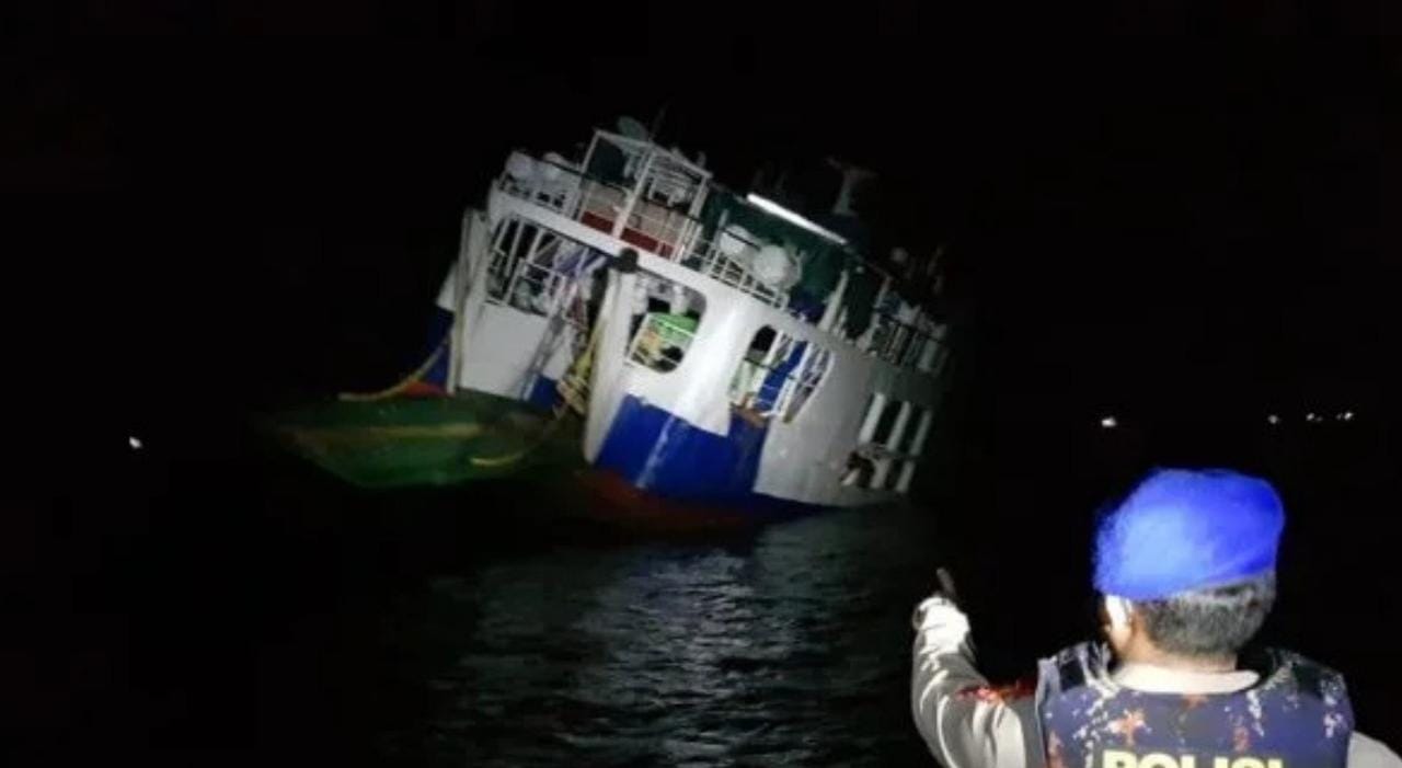 Memang ada juga media, seperti duta.tv, yang menyebutnya “karam” —pakai tanda petik. Maksudnya, kapal oleng, air sempat masuk setinggi satu meter. Kapal itu kandas akibat cuaca buruk, hujan lebat dan angin kencang, mengakibatkan kapal terdorong keluar lintasan ke perairan dangkal.