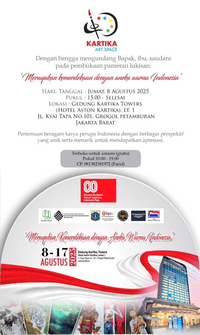 JAKARTA – Dalam semangat menyambut Hari Ulang Tahun ke-80 Kemerdekaan Republik Indonesia, Kartika Art Space menggelar pameran seni lukis bertajuk “Merayakan Kemerdekaan dengan Aneka Warna Indonesia”. Pameran ini berlangsung mulai 8 hingga 17 Agustus 2025 di lantai satu Gedung Kartika Towers, Jalan Kyai Tapa, Grogol, Jakarta Barat.