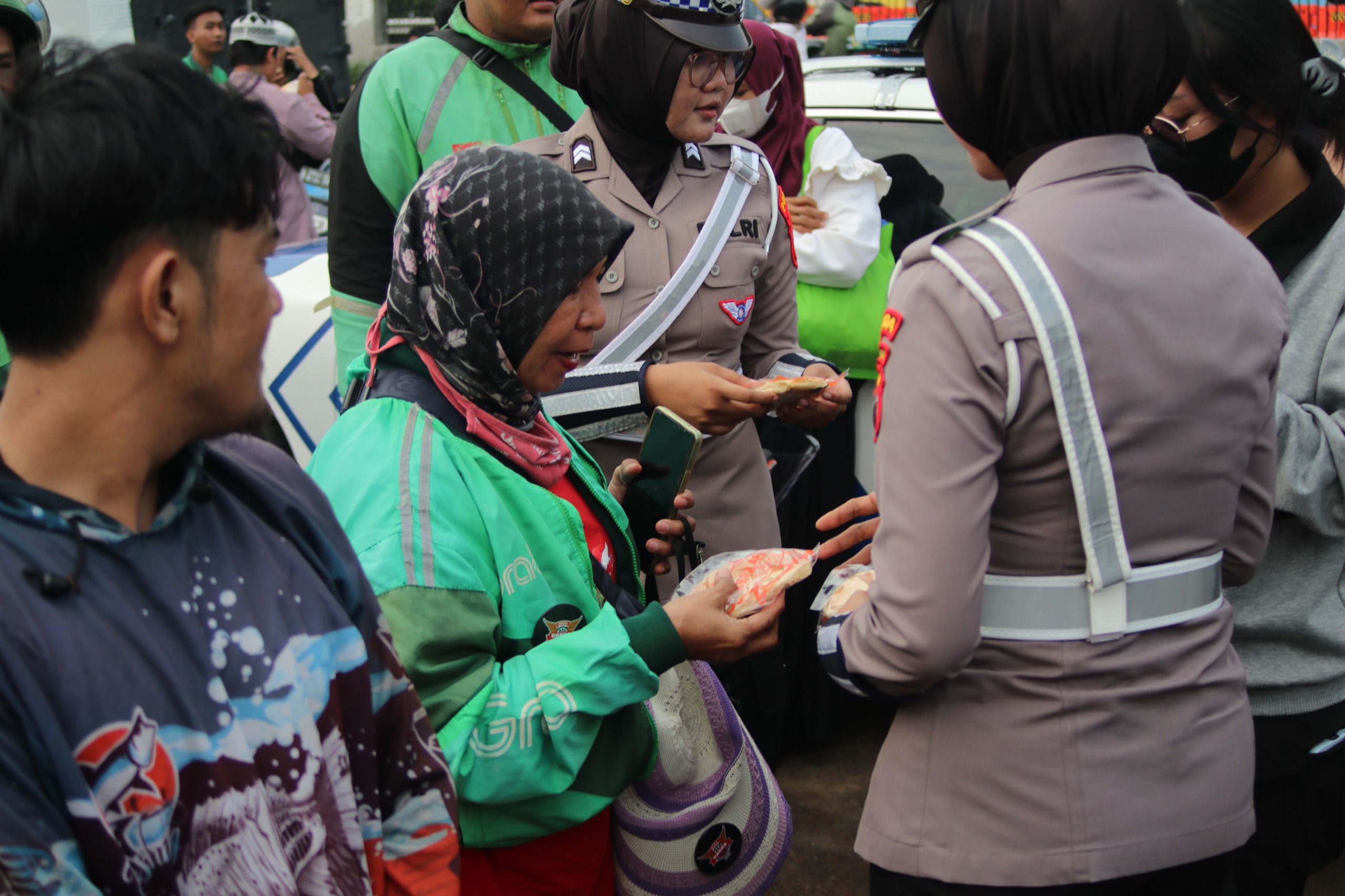 Mereka membagikan sekitar 200 bungkus roti dan air mineral. Bagi-bagi roti dan air mineral ini dilakukan oleh jajaran satuan polisi lalu lintas (polantas) saat demo berlangsung.