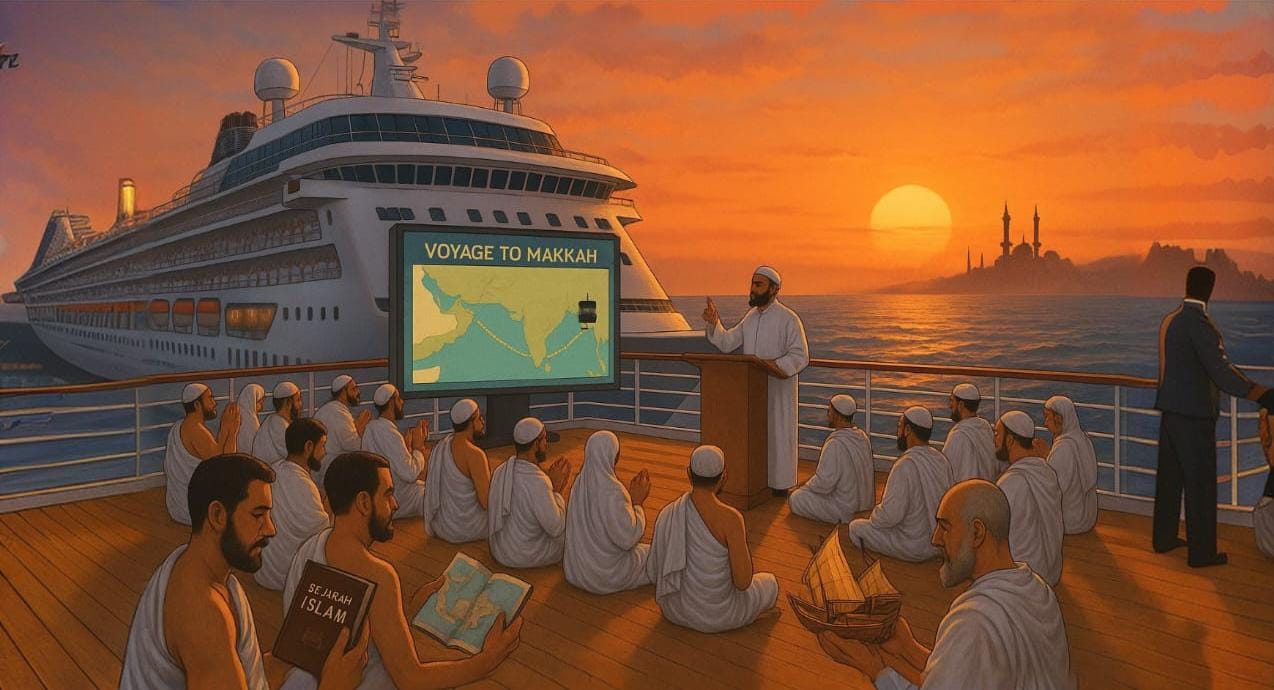 Bayangkan sebuah kapal mewah raksasa mengarungi Samudra Hindia, layar digital di dek menampilkan peta menuju Tanah Suci, dan para jamaah mengenakan ihram sambil mendengar tausiyah dari Ustaz Abdul Somad di tengah semilir angin laut.